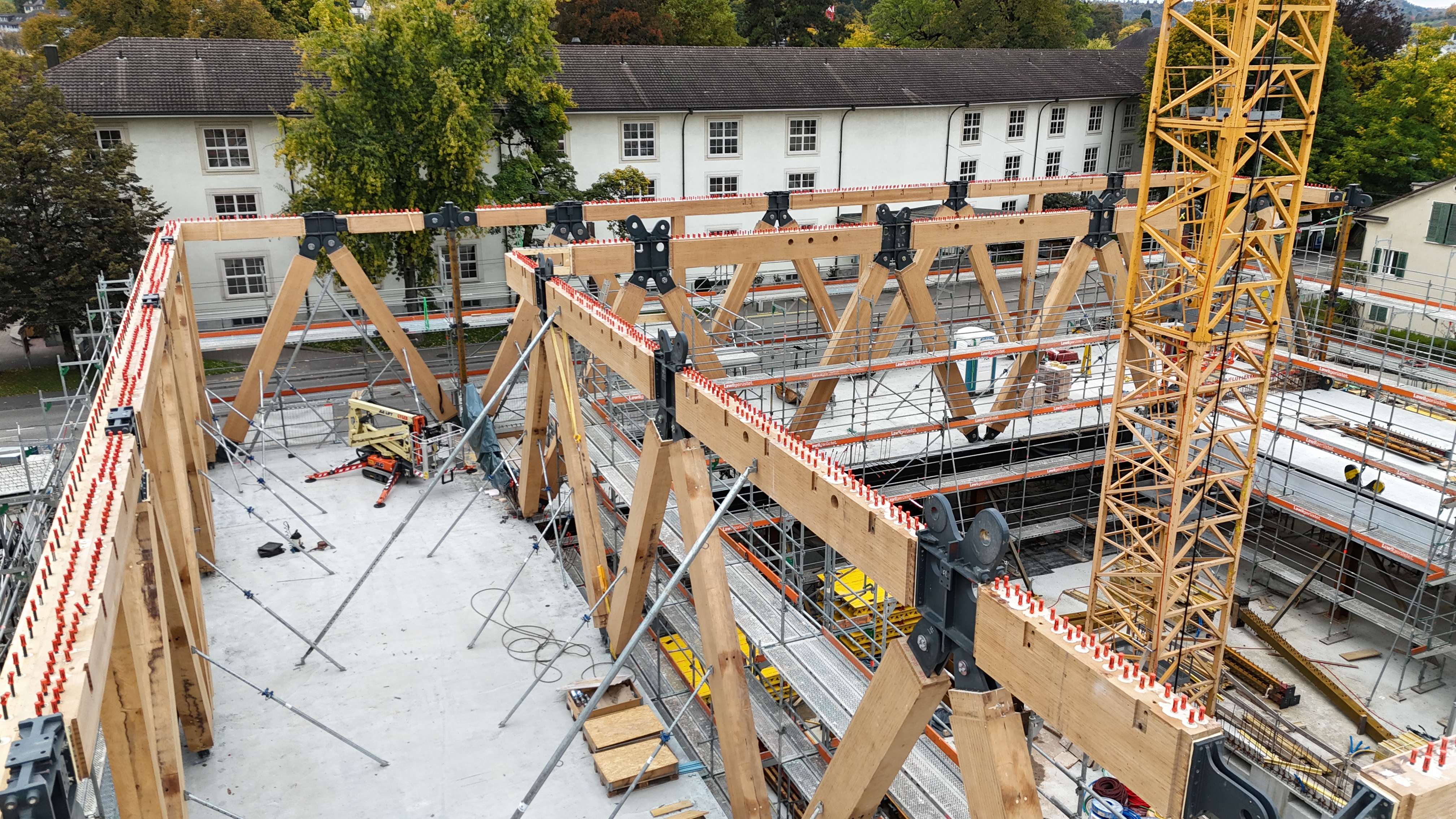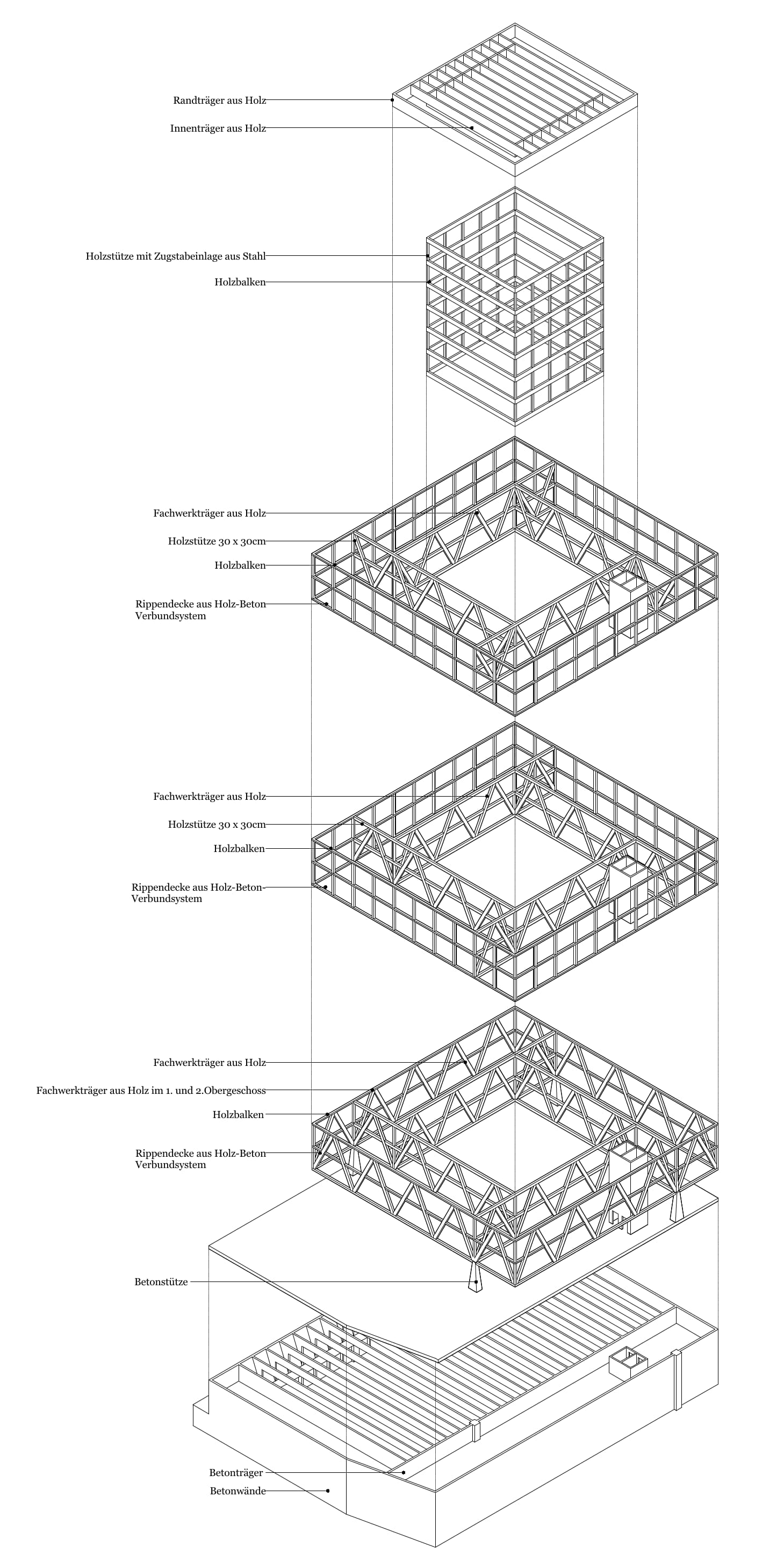 "Das Projekt umfasst eine Dreifachturnhalle im UG und einen in Holz- und Holz-Beton-Verbundbauweise ausgeführten Obergeschossbau. Zentrales Element ist ein windmühlenartig angeordnetes Fachwerk aus BauBuche, das die Lasten auf vier Stützen im EG trägt. Zusammen mit HBV-Rippendecken, einer CLT-Atriumstruktur und Dach-Stahlfachwerken entsteht ein komplexes Tragwerk, dessen Strukturverhalten mithilfe von AxisVM präzise modelliert und analysiert wurde."