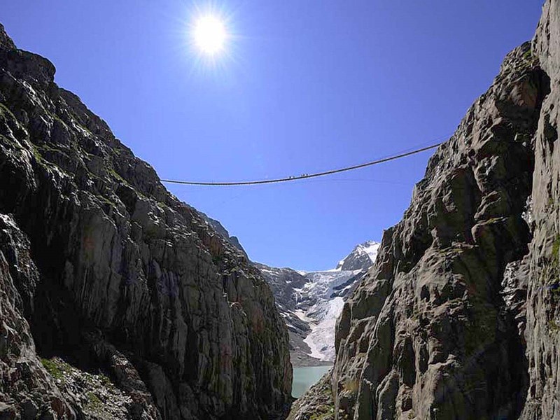 "Le pont suspendu avec une longueur de 170m offre un accès sûr à la cabane Trift proche du col de Susten en Suisse.